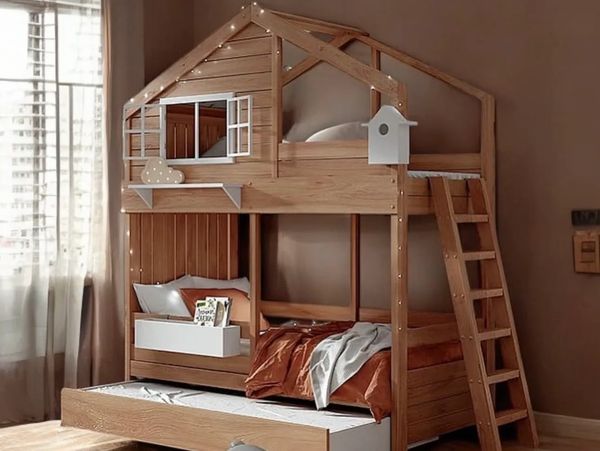 Una Litera cálida y natural por su acabado en tono nogal. Incluye espacio para 3 colchones individuales o usa el cajón inferior para ropa o juguetes ya que es extraible con ruedas. Incluye una casita de aves, repisa y porta libros